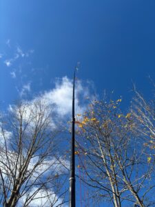I was both surprised and delighted that my “DX Commander” prototype survived the winds Saturday night during the ARRL Sweepstakes phone contest. A 41 foot (12.5m) mast was held up by three 10″ (25.cm) tent stakes from Walmart! I checked in on it Sunday morning and snugged up the guy ropes. Man, the wind was still howling!