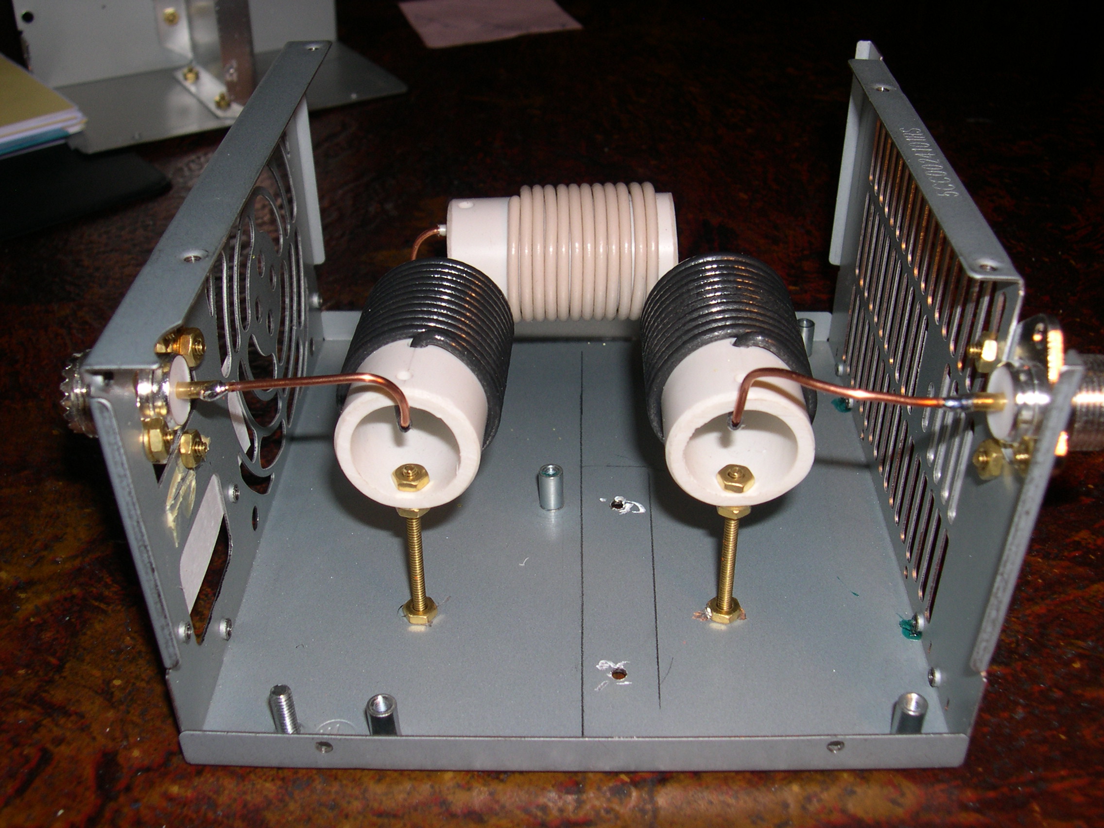Mount the shield to two sides of the cover along the center line with four 4-40 x ¼ inch brass machine screws and nuts so that it separates the input and output coils. Drill clearance holes in the base and tap holes in the shield to secure it in place when the cover is installed.